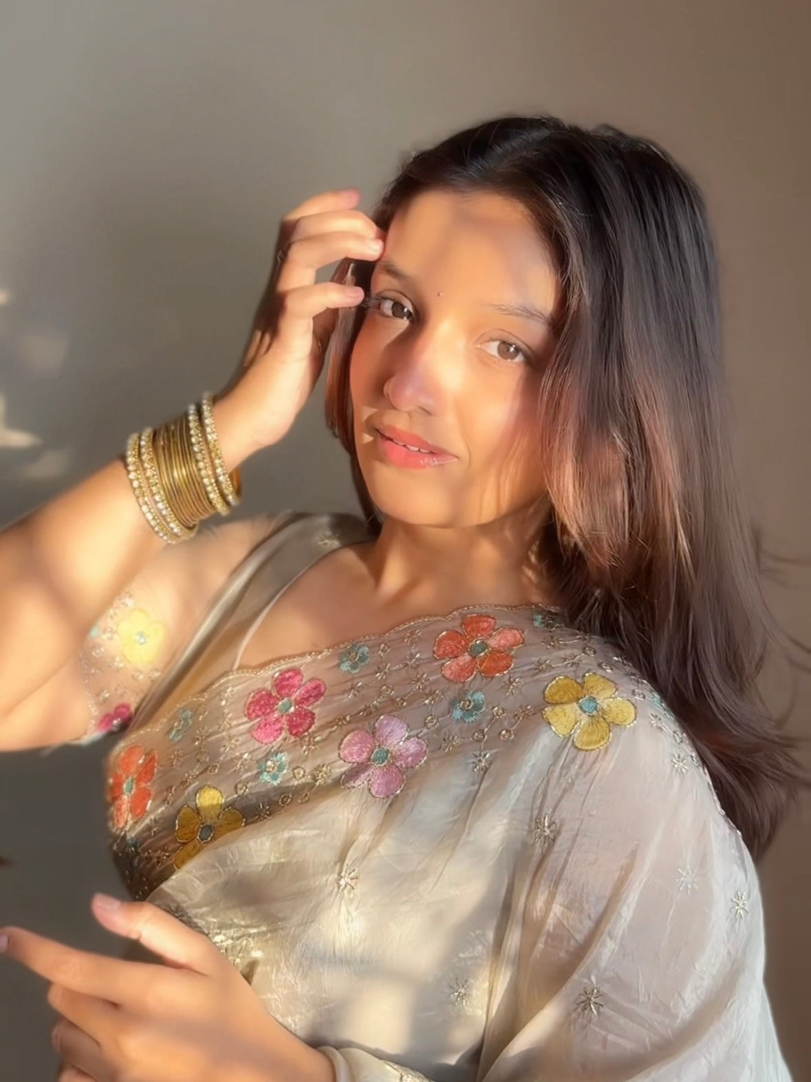 where grace meets glamour in this ethereal dusty beige saree adorned with exquisite beads and thread embroidery.