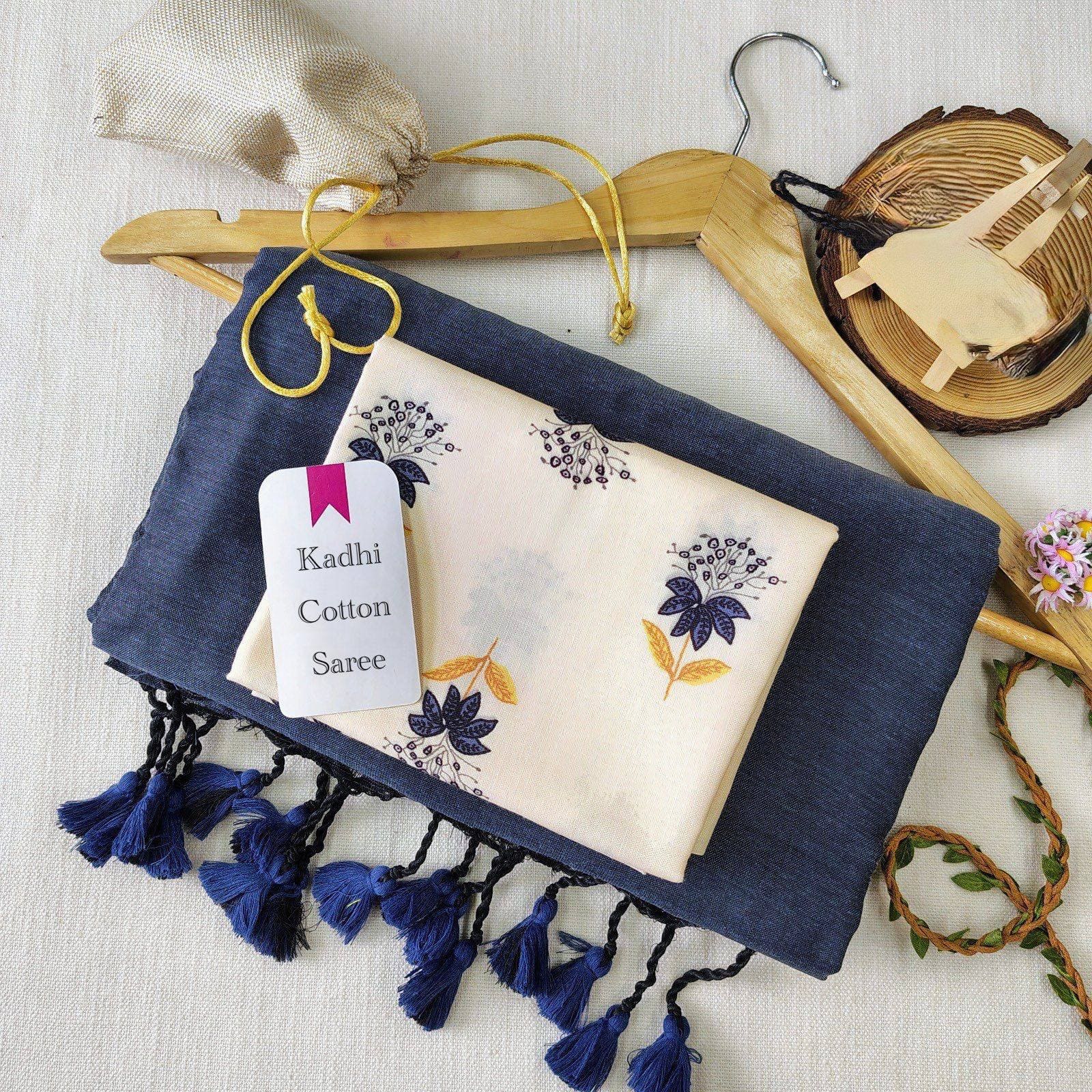 Dark Blue Khadi Cotton Saree with off-white Printed Blouse