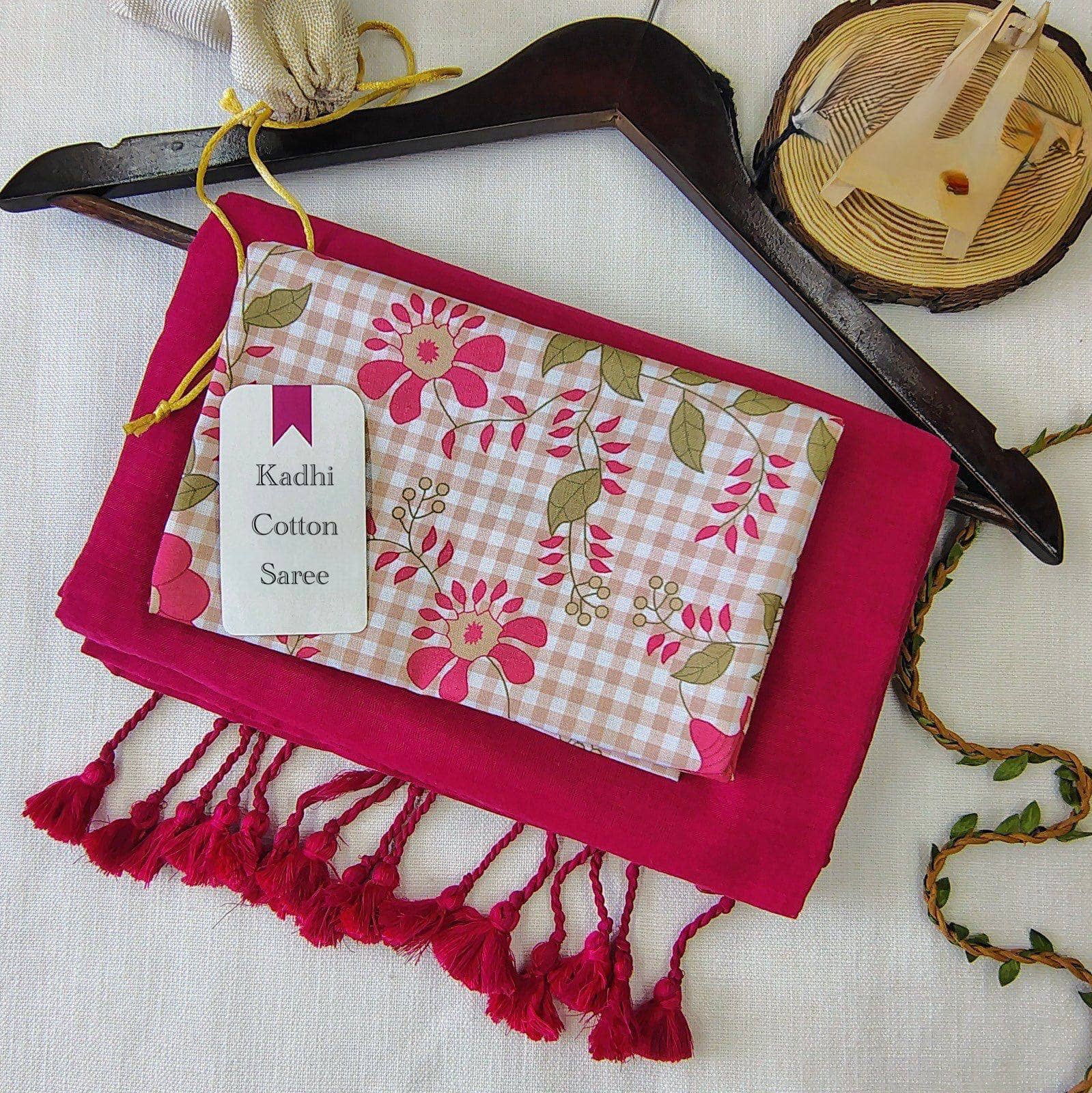 Magenta Khadi Cotton Saree with Floral Print Blouse