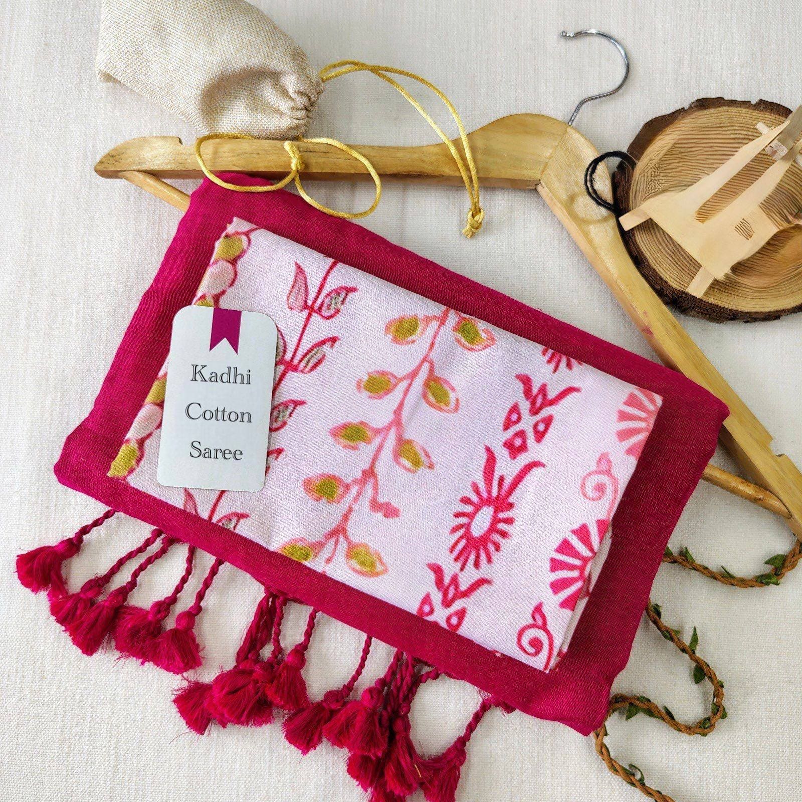 Magenta Pink Khadi Cotton Saree with White Printed Blouse