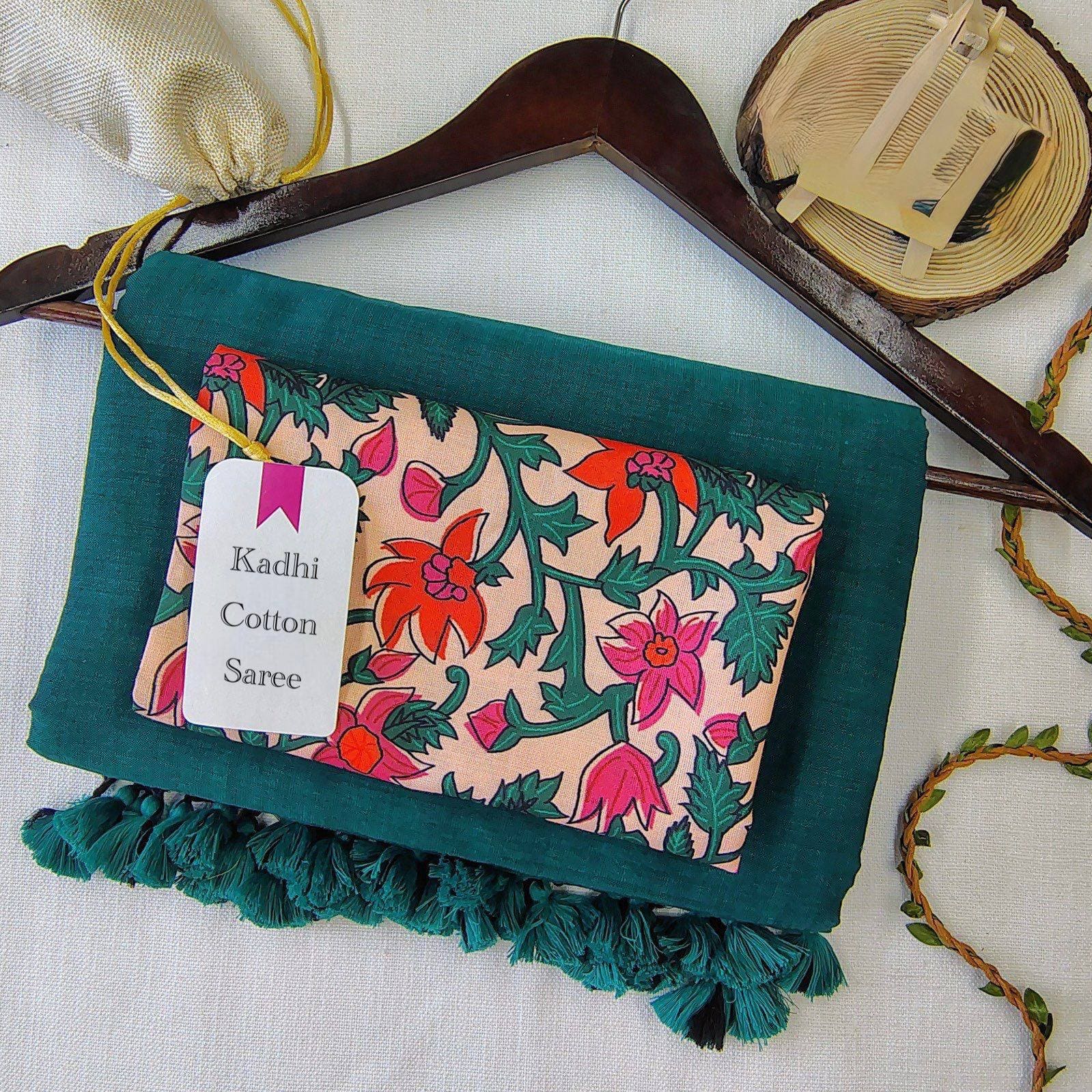 Teal Blue Khadi Cotton Saree with Printed Blouse